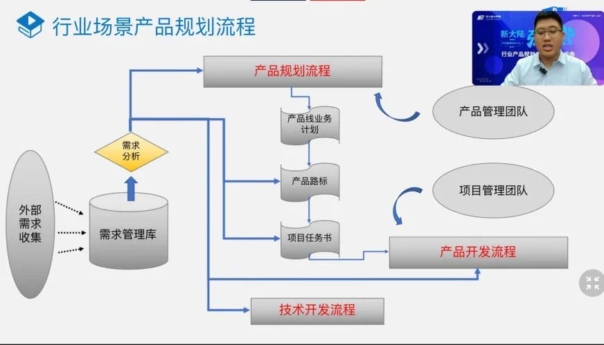 在交流會上,曾煜講師憑借其豐富的實戰(zhàn)經(jīng)驗和專業(yè)知識,為參會學(xué)員帶來了一場深度探討產(chǎn)品管理的精彩分享。他圍繞行業(yè)背景調(diào)研方法、行業(yè)產(chǎn)品需求思考、產(chǎn)品能力規(guī)劃與建設(shè)、產(chǎn)品上市及生命周期管理,向?qū)W員深入解讀了產(chǎn)品管理的四步曲。他首先從行業(yè)場景產(chǎn)品建設(shè)切入,詳細(xì)介紹了如何運用PEST分析法把握宏觀環(huán)境,以及如何利用波特五力模型洞察行業(yè)趨勢。隨后,他以國通公司的產(chǎn)品建設(shè)為例,進(jìn)一步探討了如何將行業(yè)需求與自身產(chǎn)品能力融合,詳盡闡述了行業(yè)場景產(chǎn)品規(guī)劃的完整流程。此外,他還全面介紹了產(chǎn)品項目管理的關(guān)鍵要素,包括需求管控、溝通機(jī)制、激勵機(jī)制和風(fēng)險管理,并對產(chǎn)品試點工作安排與計劃、市場發(fā)布流程以及生命周期管理進(jìn)行了詳盡介紹。