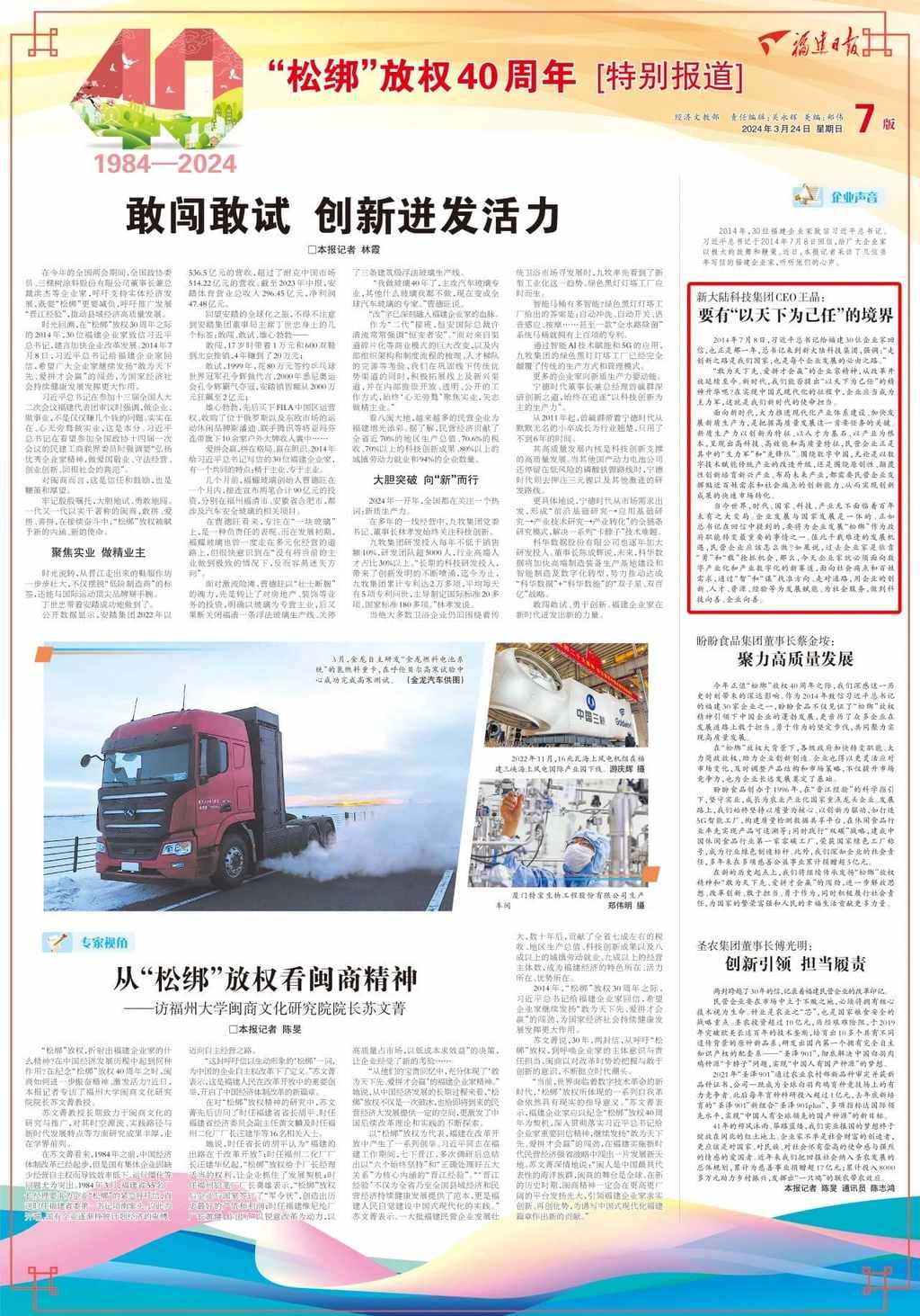 值此習近平總書記回信十周年之際,福建日報推出6版《“松綁”放權四十周年特別報道》,特別專訪當年寫信的企業(yè)家代表新大陸科技集團CEO王晶。今日官微轉發(fā)報道全文,以饗讀者。