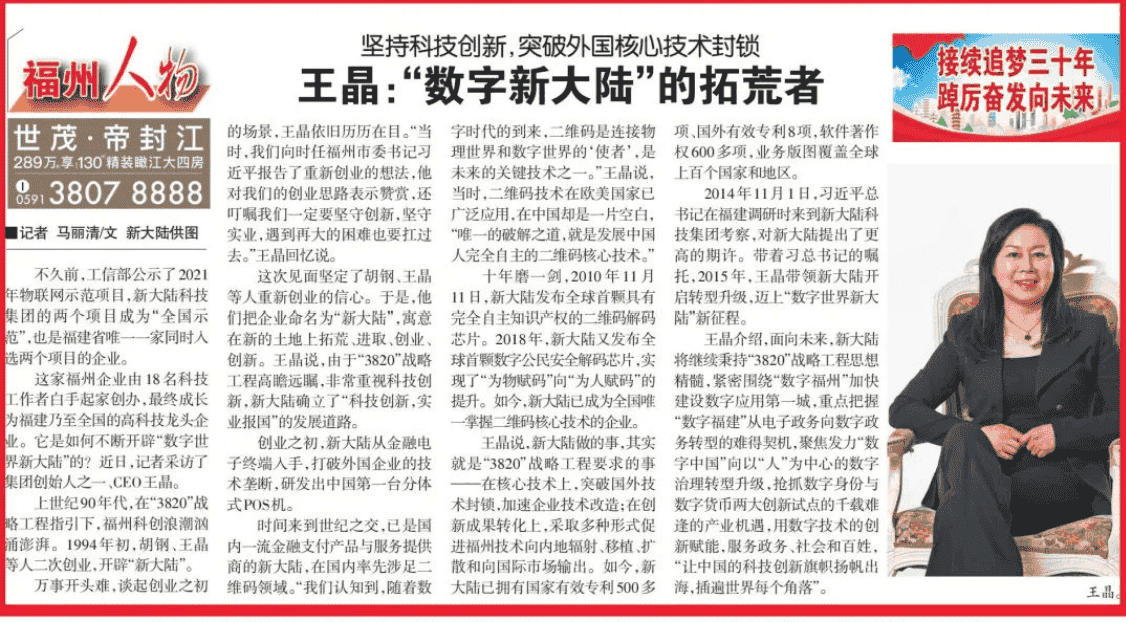 福州晚報5月22日發(fā)表專題報道《王晶:“數(shù)字新大陸”的拓荒者》,學(xué)習(xí)強國平臺轉(zhuǎn)發(fā),新大陸科技集團官微今日全文刊發(fā),以饗讀者。